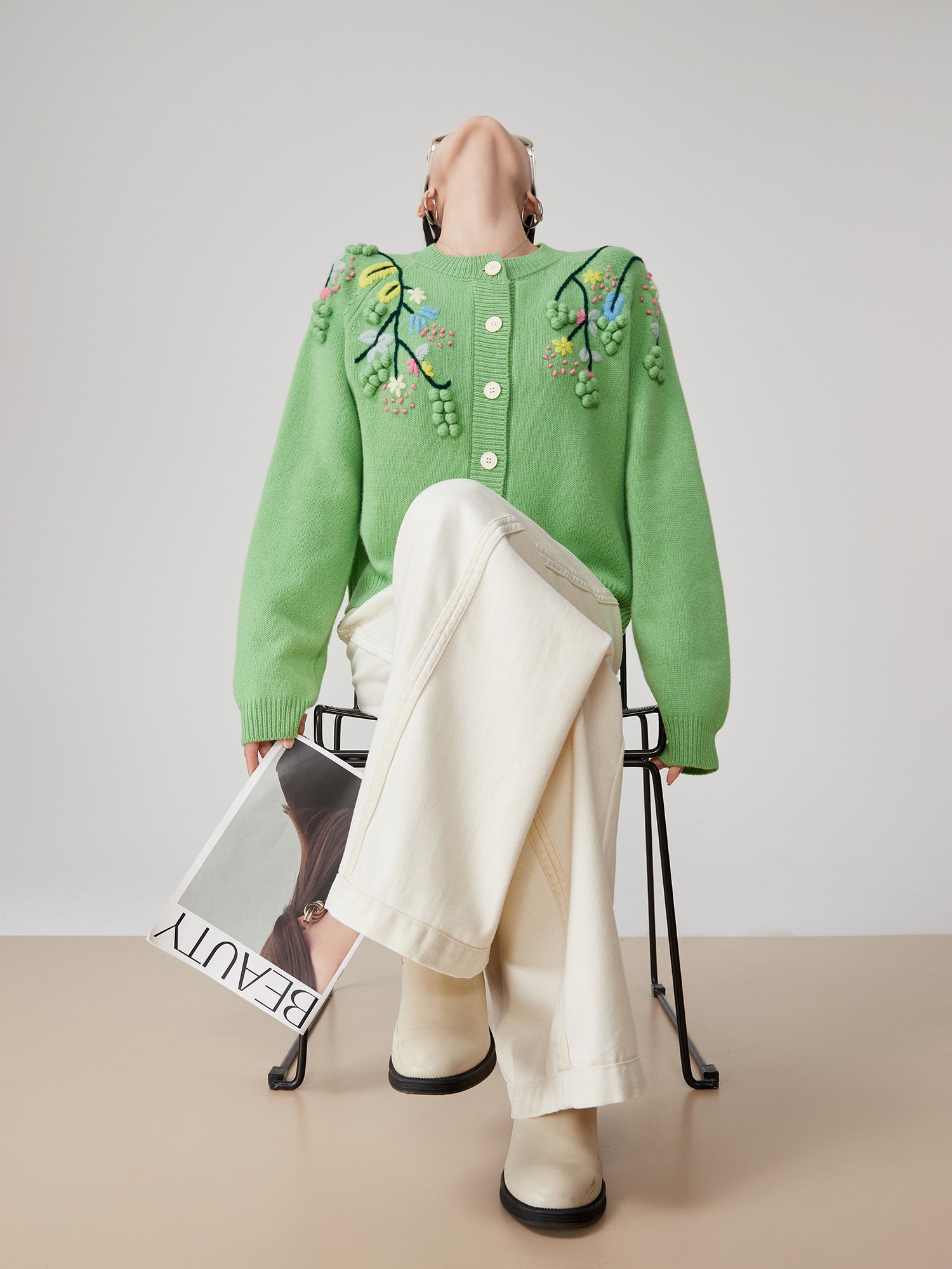 Green Handmade Three-dimensional Embroidered Round Neck Knitted Cardigan For Women
