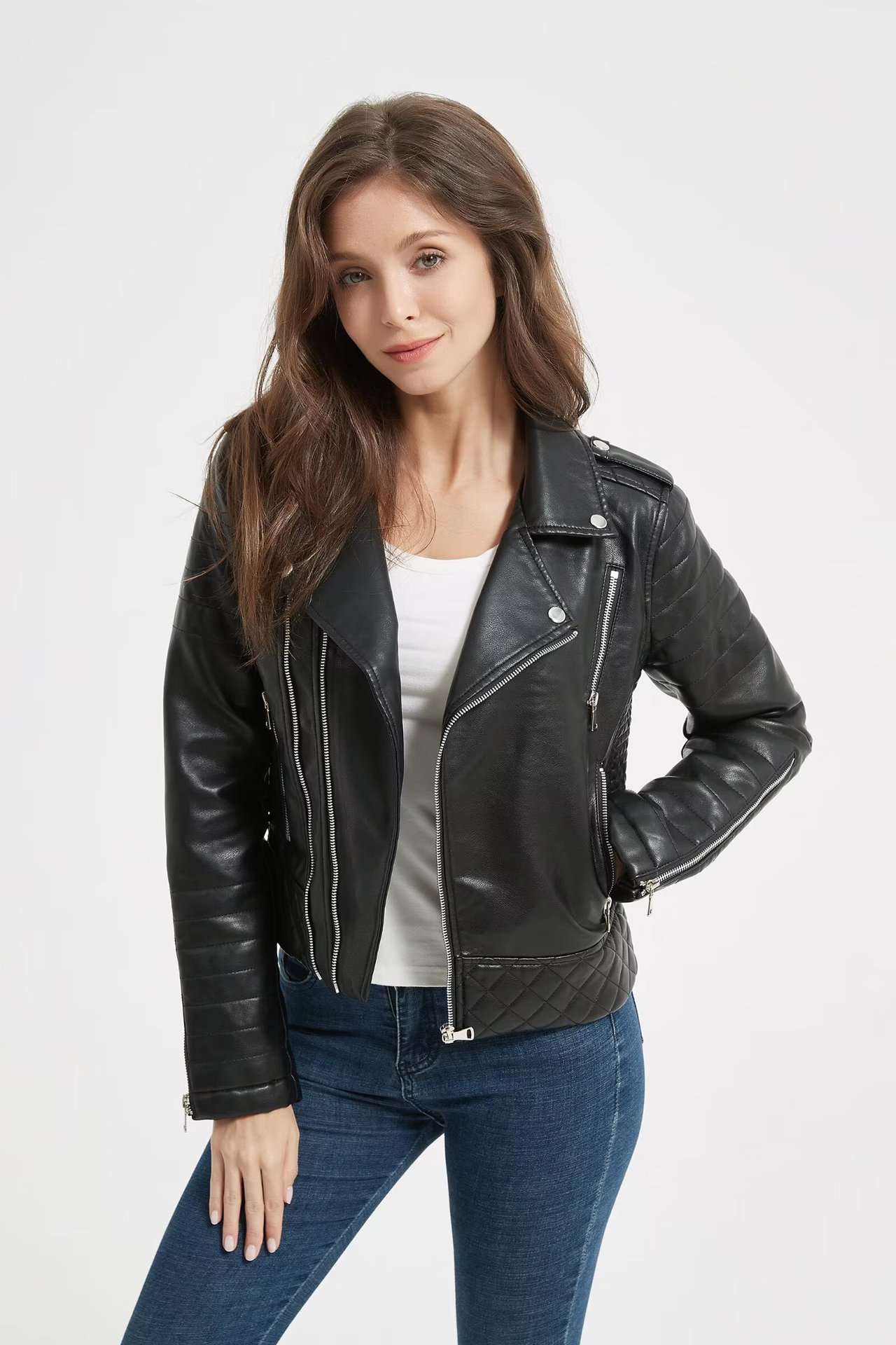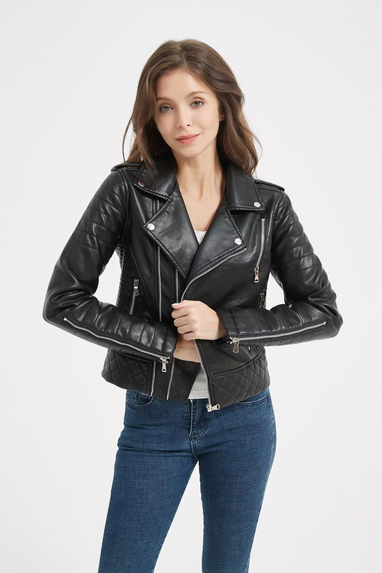 Product information: Color: Black Sizes: S, M, L, XL, XXL Fit: Slim fit Style Category: Streetwear Fur Collar: No fur collar Trendy Element: Zipper Leather Type: Leather Fabric Name: Leather Sleeve Style: Regular sleeve