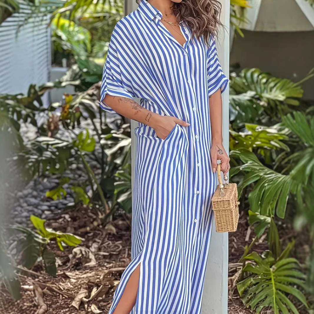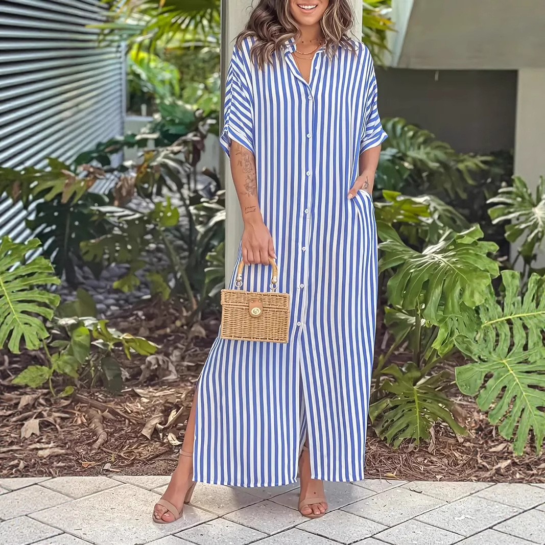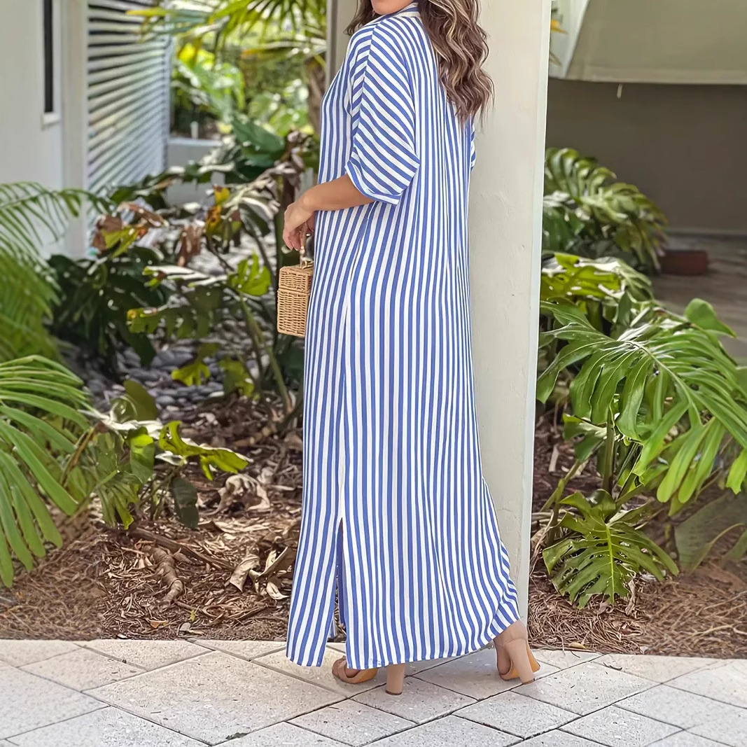 Product information: Sizes: S, M, L, XL, XXL Style: Single-piece Skirt Length: Long skirt Fashion Element: Printed Style: Shirt dress Fabric Name: Synthetic fiber blend Sleeve Style: Regular sleeves Main Fabric Composition: Polyester Sleeve Length: Three-quarter length sleeves