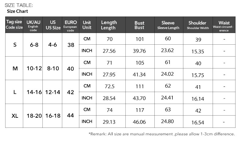 1. Asian sizes are 1 to 2 sizes smaller than European and American people. Choose the larger size if your size between two sizes. Please allow 2-3cm differences due to manual measurement. 2. Please check the size chart carefully before you buy the item, if you don't know how to choose size, please contact our customer service. 3.As you know, the different computers display colors differently, the color of the actual item may vary slightly from the following images.